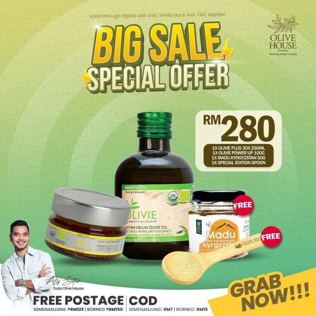 Satu sudu teh OLIVIE POWER UP bersamaan 10 liter minyak zaitun Extra Virgin (PMZ)