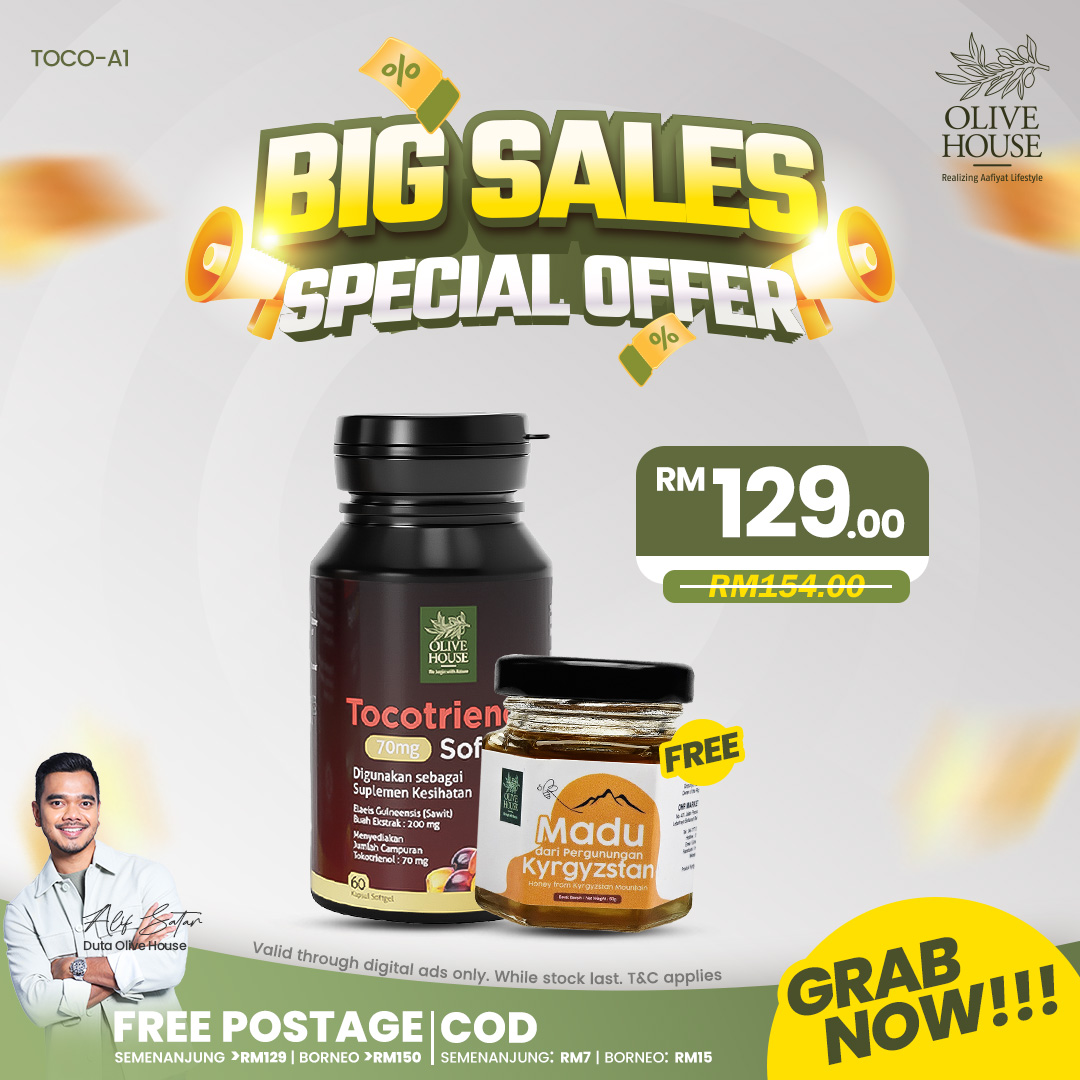 Olivie Plus 30x 250ml + Tocotrienols + FREE Minyak Habbatus Sauda 50ml + FREE Madu Kyrgyzstan 50g + FREE Ubat Gigi Garam Bukit